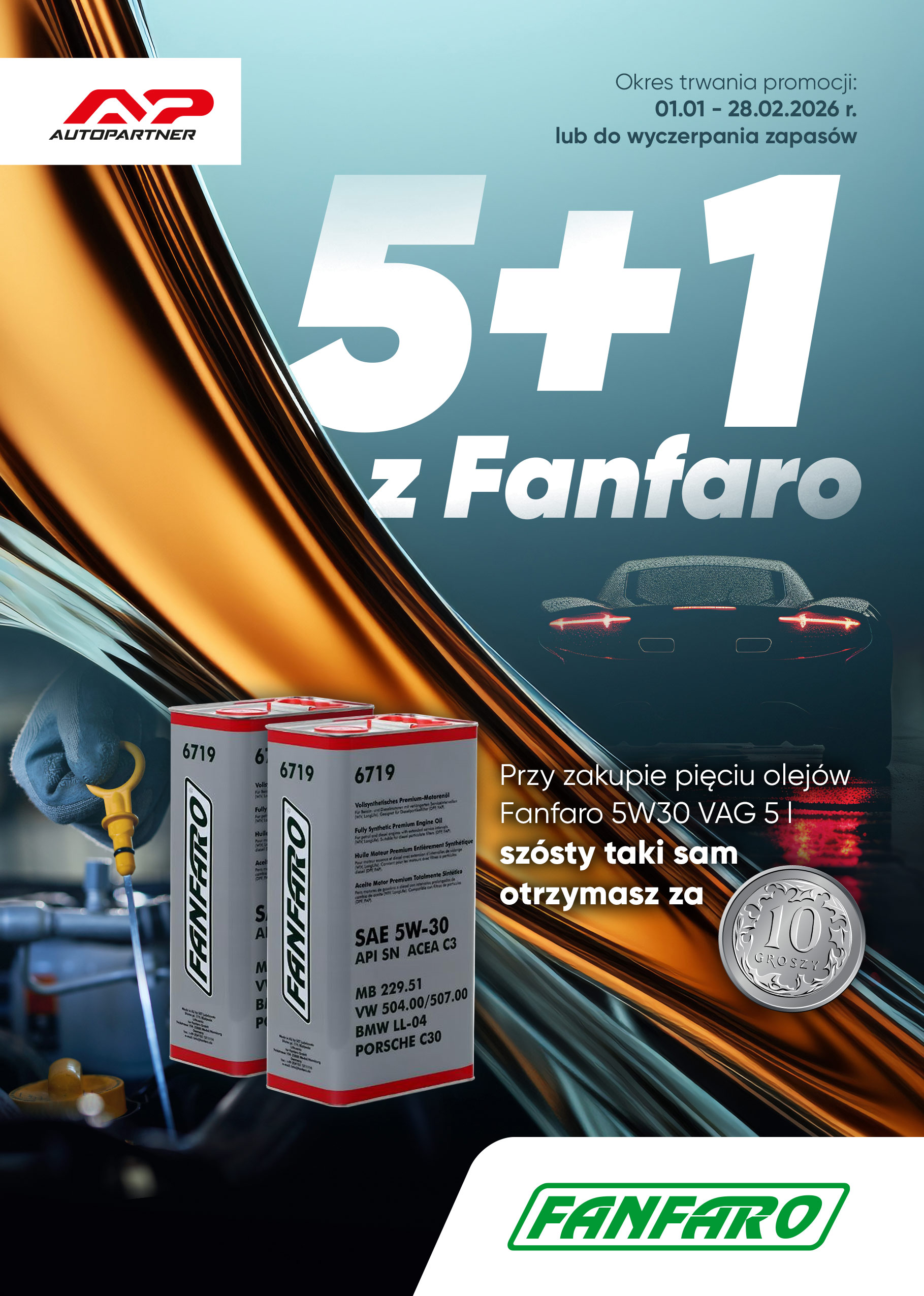 Dokonaj jednorazowego zakupu zestawu pięciu olejów Fanfaro 5W30 5L VAG (FF6719-5ME), a szósty taki sam olej otrzymasz za 10 groszy netto!
