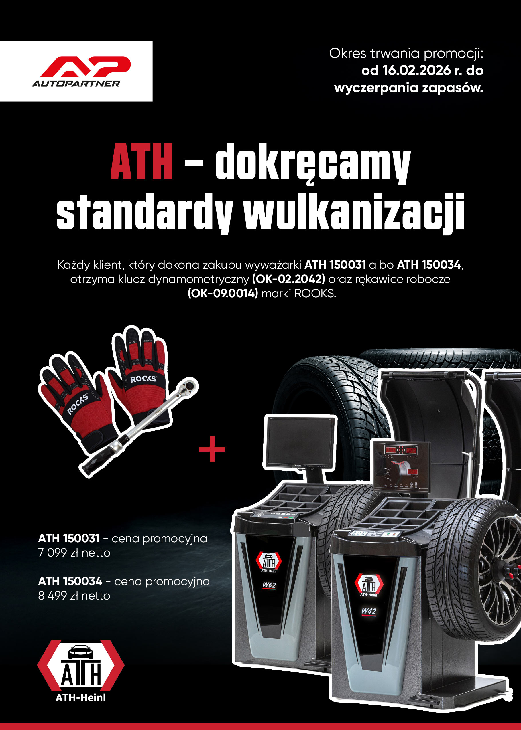 Każdy klient, który dokona zakupu wyważarki ATH 150031 albo ATH 150034, otrzyma klucz dynamometryczny (OK-02.2042) oraz rękawice robocze (OK-09.0014) marki ROOKS.
