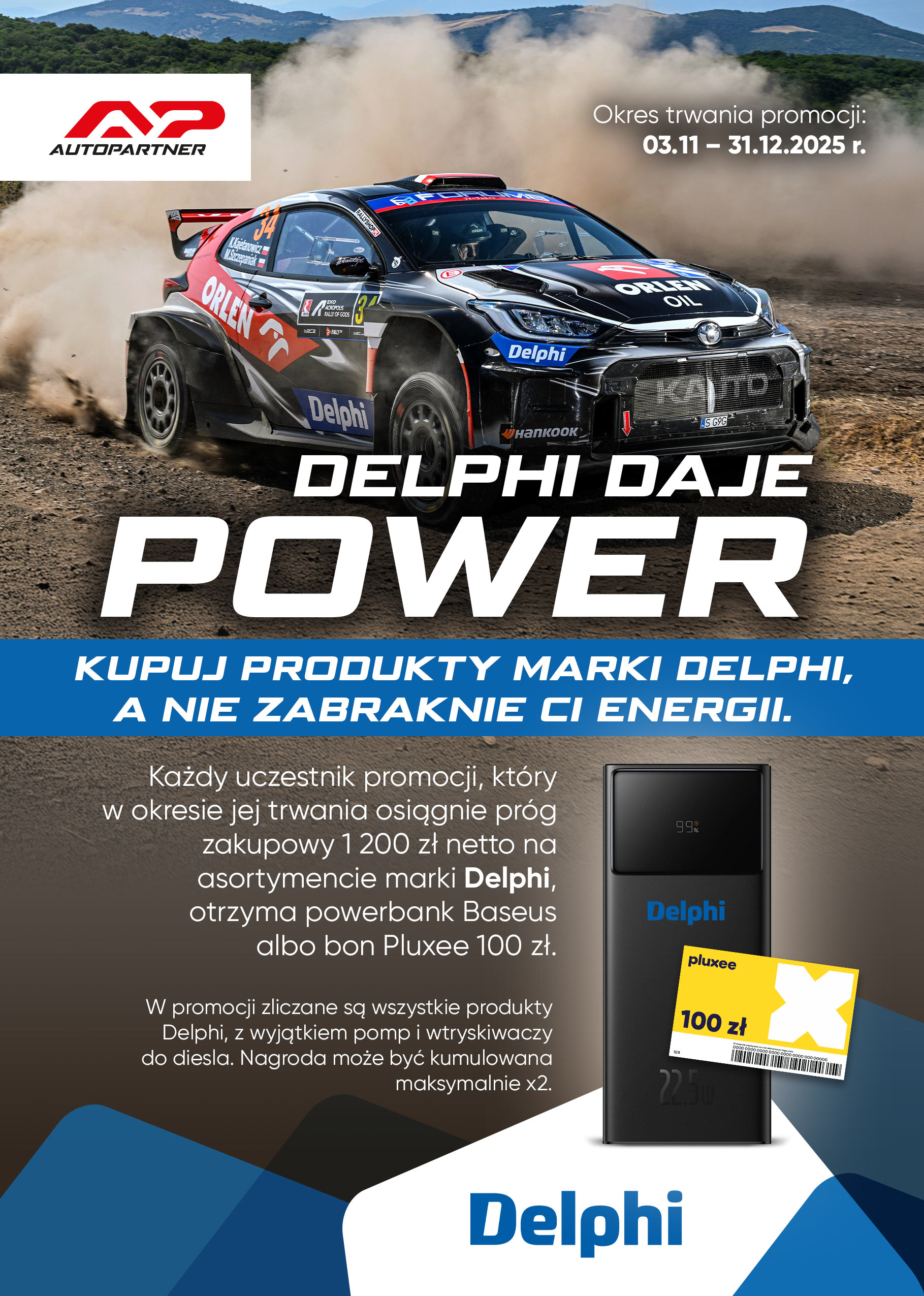 1 200 zł netto na asortymencie Delphi, otrzyma powerbank Baseus albo bon Pluxee 100 zł.
