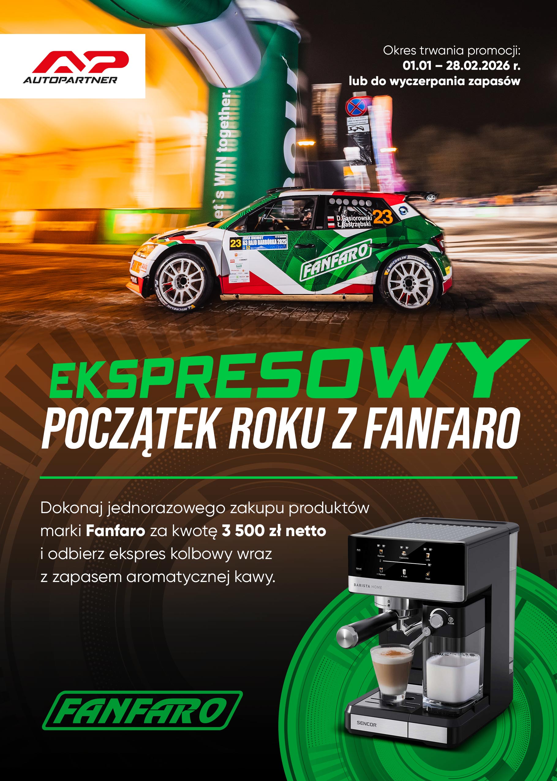 Każdy uczestnik promocji, który w okresie jej trwania dokona jednorazowego* zakupu produktów marki Fanfaro za kwotę 3 500 zł netto, otrzyma ekspres kolbowy wraz z zapasem aromatycznej kawy.