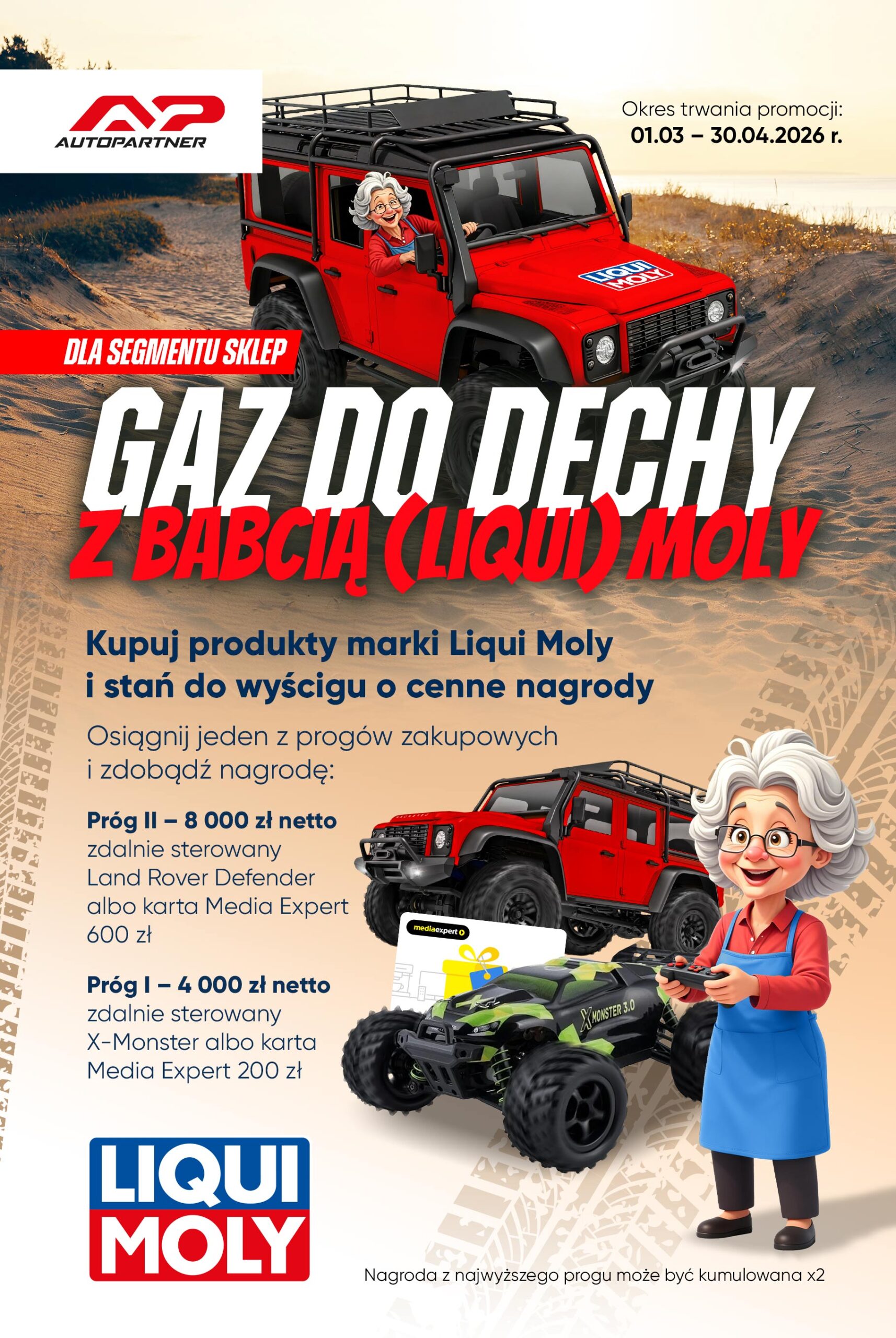 Każdy uczestnik promocji, który w trakcie jej trwania osiągnie jeden z progów zakupowych na asortymencie marki Liqui Moly w ramach swojego segmentu (Sklep/Warsztat), otrzyma zdalnie sterowany Land Rover Defender, X-Monster albo karty do Media Expert!