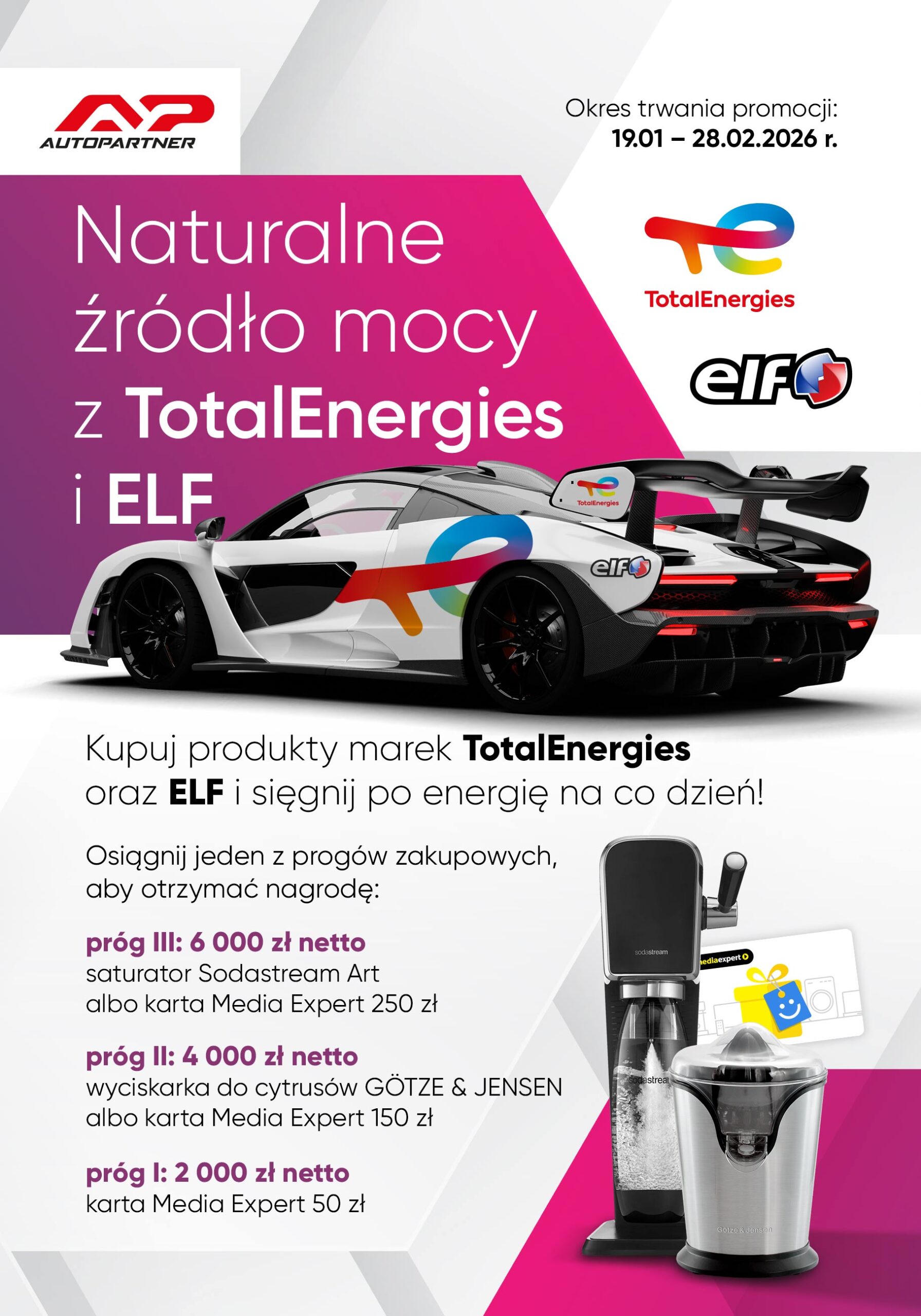 Każdy uczestnik promocji, który w trakcie jej trwania osiągnie jeden z progów zakupowych na asortymencie marek TotalEnergies i ELF, otrzyma nagrodę: