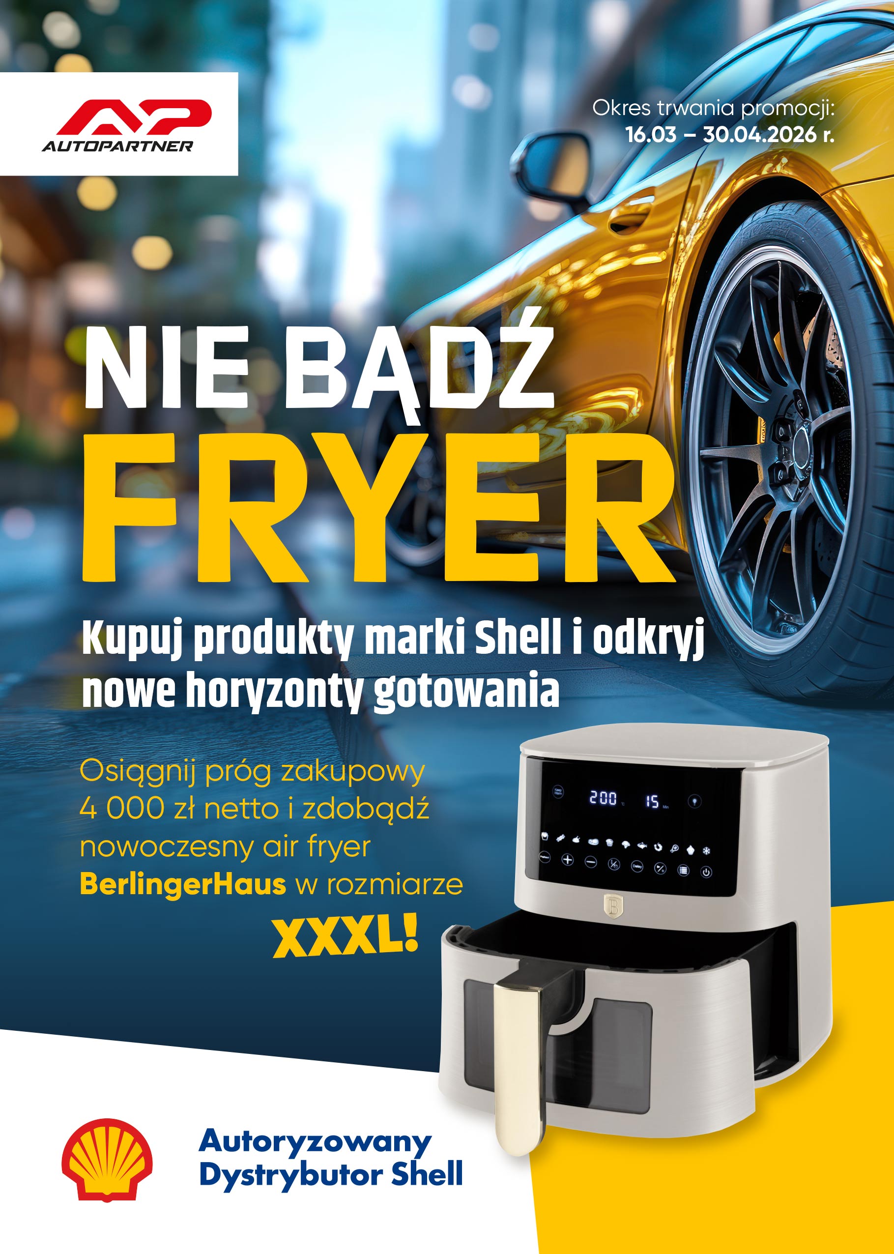 Każdy uczestnik promocji, który w okresie jej trwania osiągnie próg zakupowy 4 000 zł netto na asortymencie marki Shell, otrzyma nagrodę – air fryer BerlingerHaus Sahara Collection BH-9607.