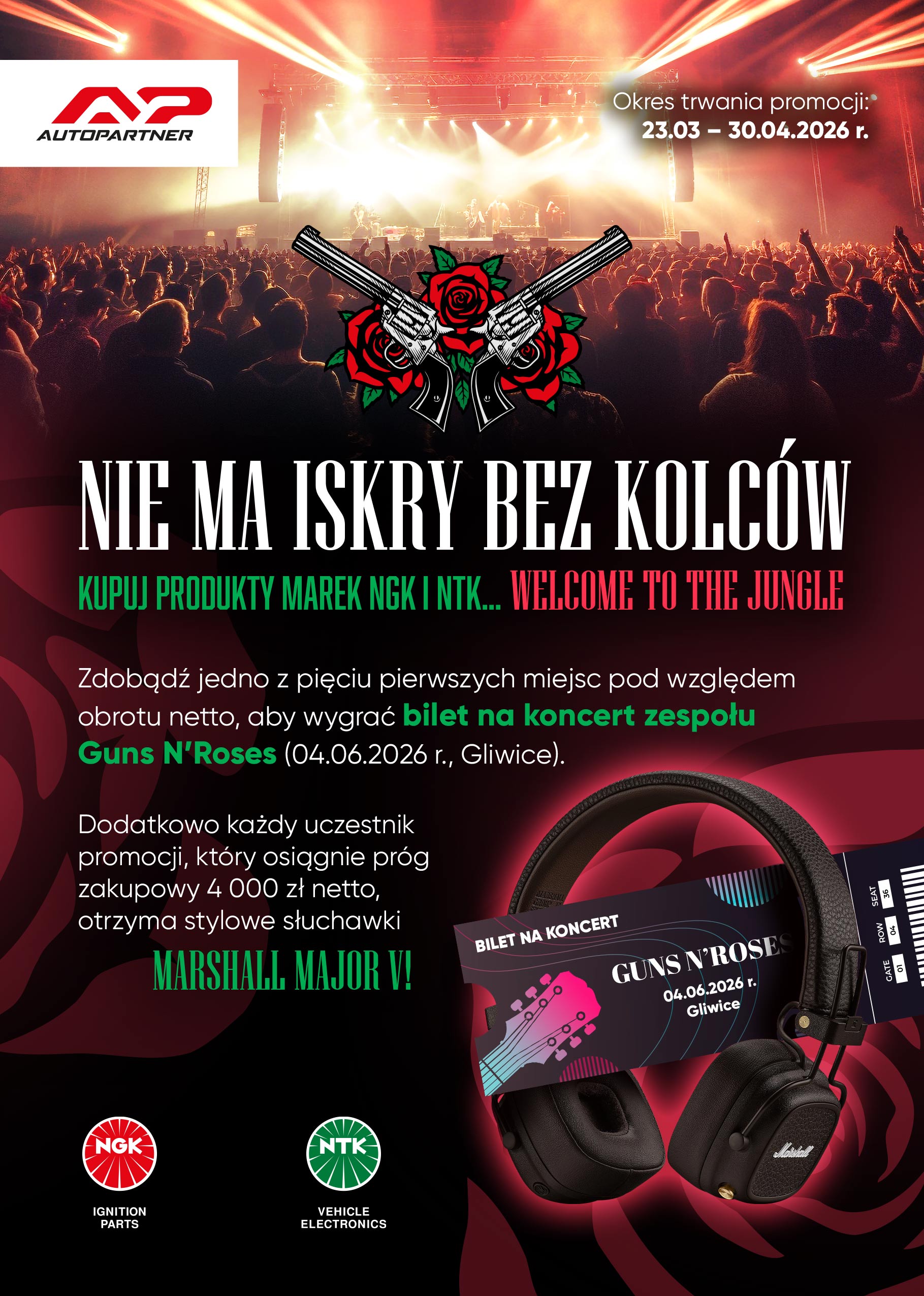 Pięciu uczestników promocji, którzy osiągną najwyższy obrót netto na asortymencie marek NGK i NTK, otrzyma bilet na koncert zespołu Guns N’Roses (04.06.2026 r., PreZero Arena, Gliwice).