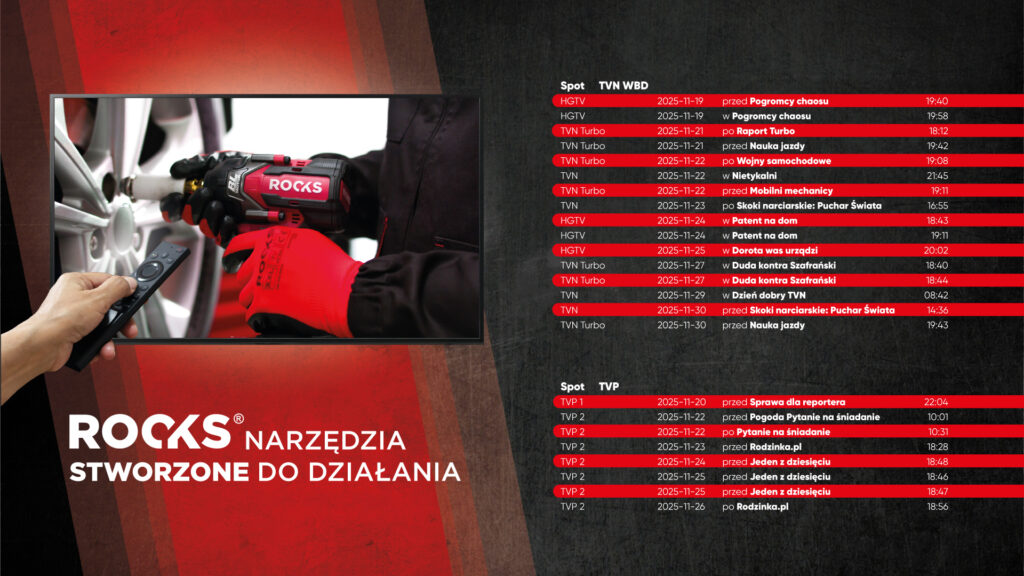 Rozpoczęliśmy emisję dwóch nowych spotów telewizyjnych ROOKS, w których prezentujemy narzędzia stworzone z myślą o profesjonalistach, a jednocześnie idealne do domowych napraw i mniejszych projektów. Każdy 15-sekundowy film pokazuje to, co w codziennej pracy liczy się najbardziej: praktyczne rozwiązania, niezawodność oraz narzędzia, na których można polegać w każdej sytuacji.