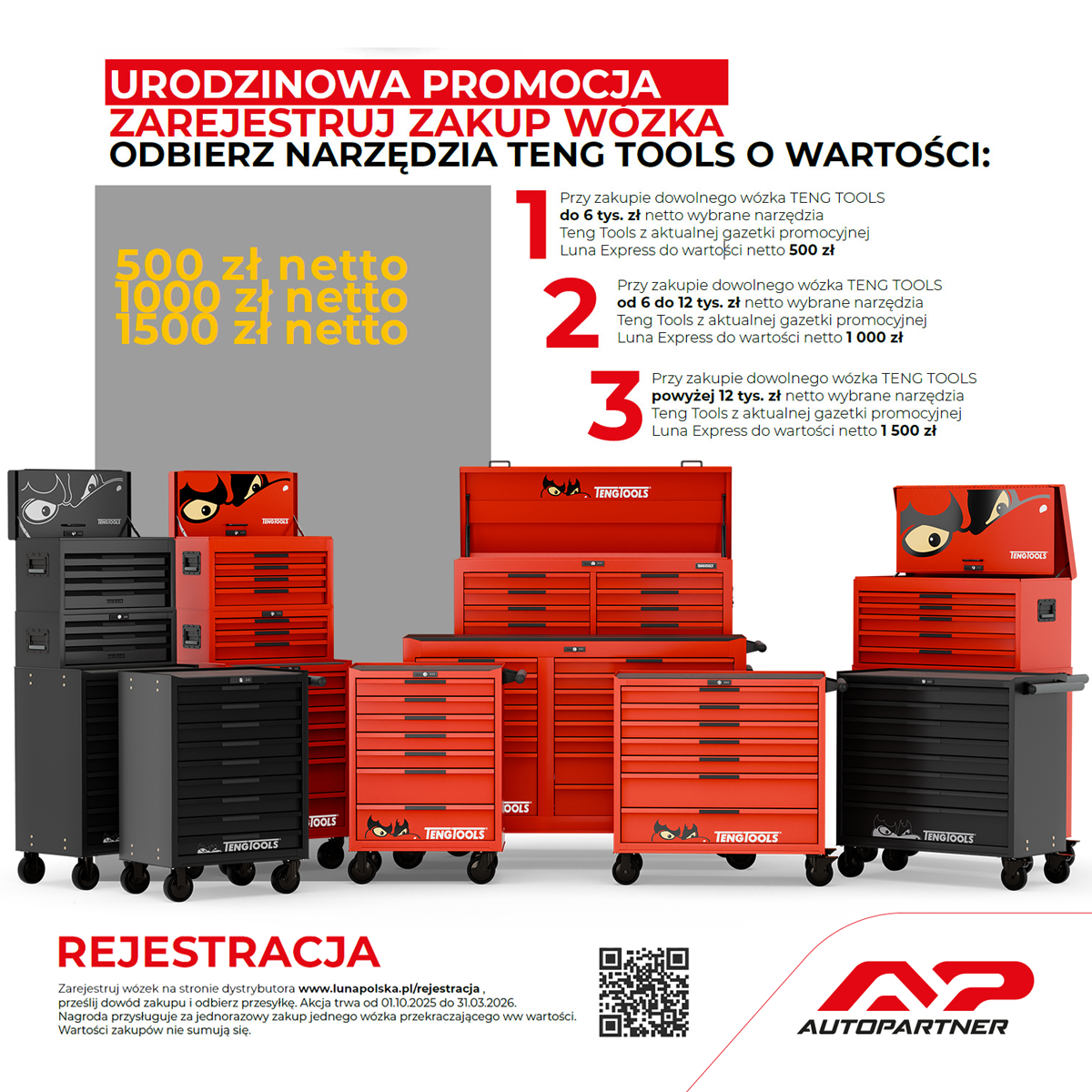 Warunkiem otrzymania nagrody jest: zakup dowolnego wózka Teng Tools w terminie 01.10. do 31.03.2026 r. oraz prawidłowe wypełnienie i przesłanie drogą elektroniczną formularza zgłoszeniowego wraz z dowodem zakupu w nieprzekraczalnym terminie do 31.03.2026 r.