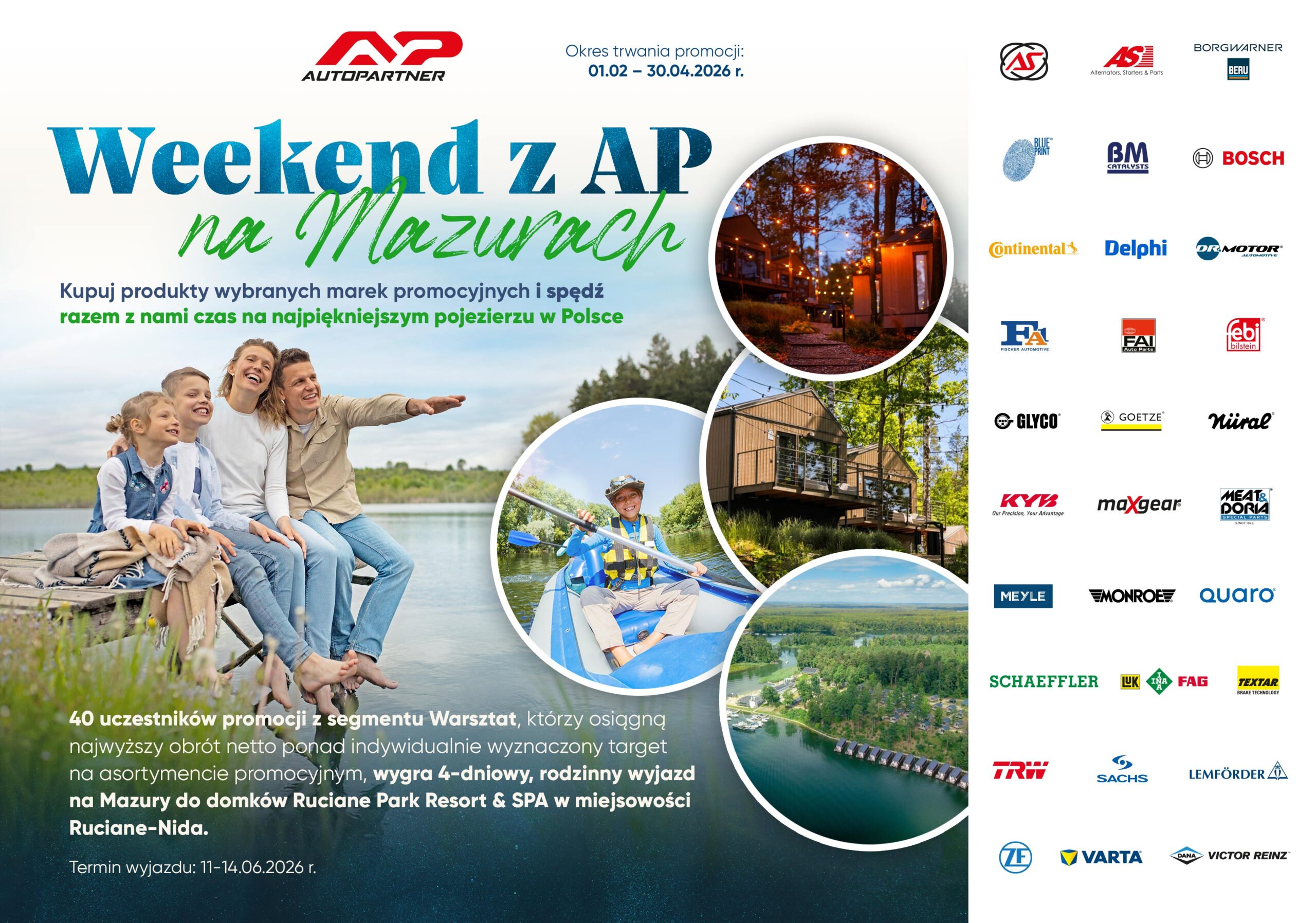 40 uczestników promocji z segmentu Warsztat, którzy osiągną najwyższy obrót netto ponad indywidualnie wyznaczony target na asortymencie promocyjnym, wygra rodzinny, 4-dniowy wyjazd na Mazury do domków Ruciane Park Resort & SPA w miejscowości Ruciane-Nida.