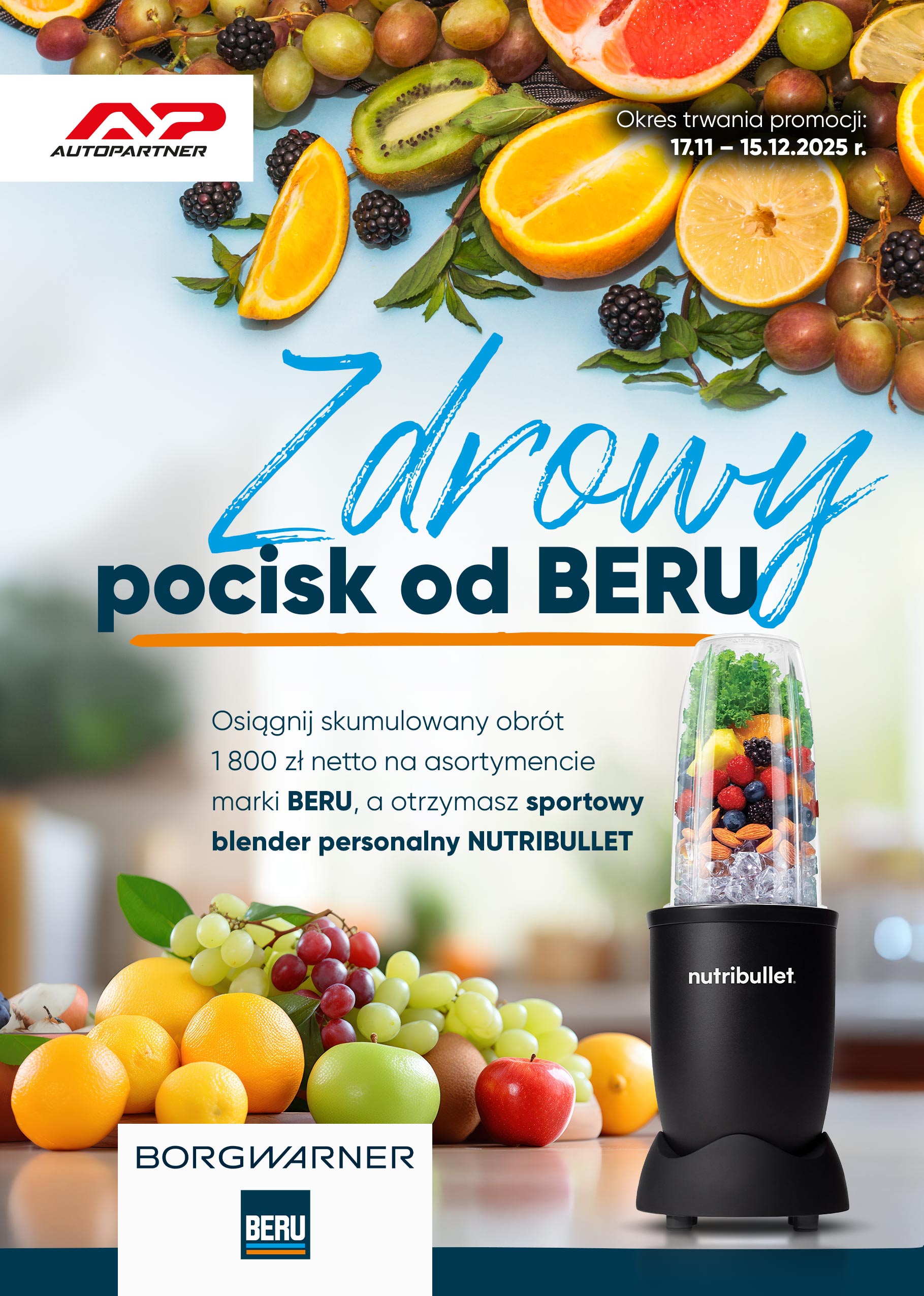 Każdy uczestnik promocji, który w okresie jej trwania osiągnie skumulowany obrót 1 800 zł netto na asortymencie marki BERU, otrzyma sportowy blender personalny NUTRIBULLET.